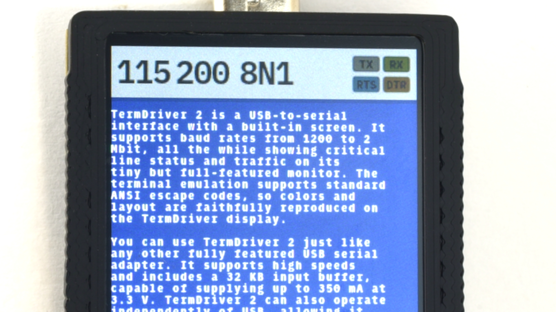 TermDriver 2 is a USB-to-serial interface with a built-in screen. It supports baud rates from 110 bit/s to 2 Mbit/s, all the while showing critical line status and traffic on its tiny yet full-featured monitor. The terminal emulation supports standard ANSI escape codes, so colors and layout are faithfully reproduced on the TermDriver display.
